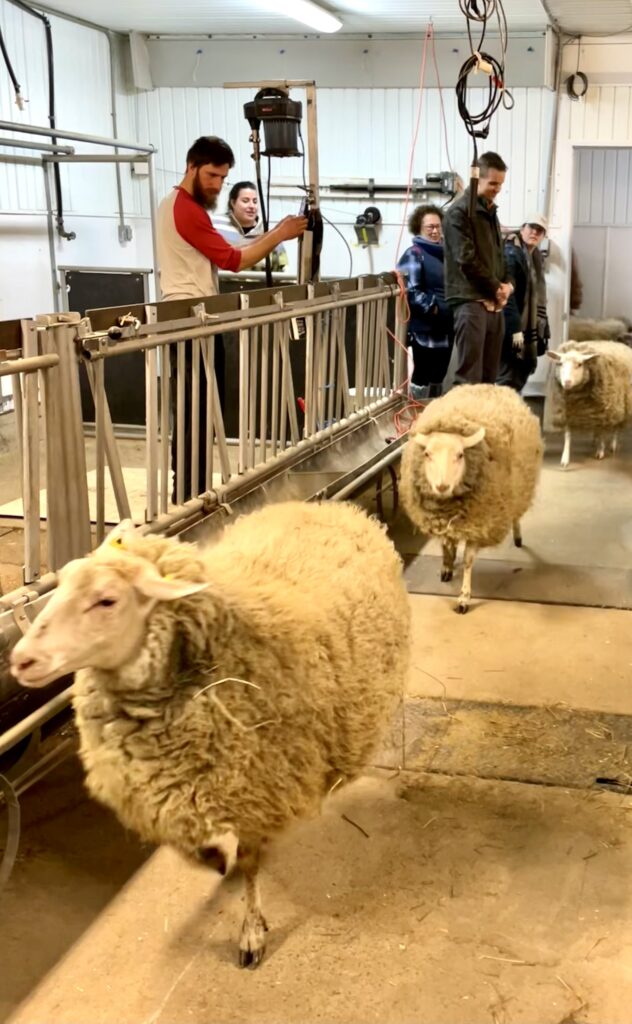 Le tondeur, Jean-Michel Popik, est un champion canadien ayant remporté plusieurs compétitions internationales. Il procède avec des gestes précis, rapides, en tout respect des moutons. Bien que nerveux à leur arrivée dans l’enclos, ils se laissent faire sans protester.